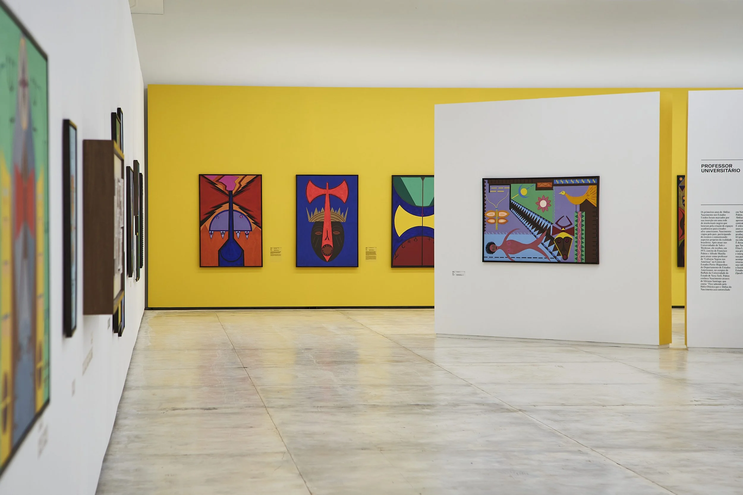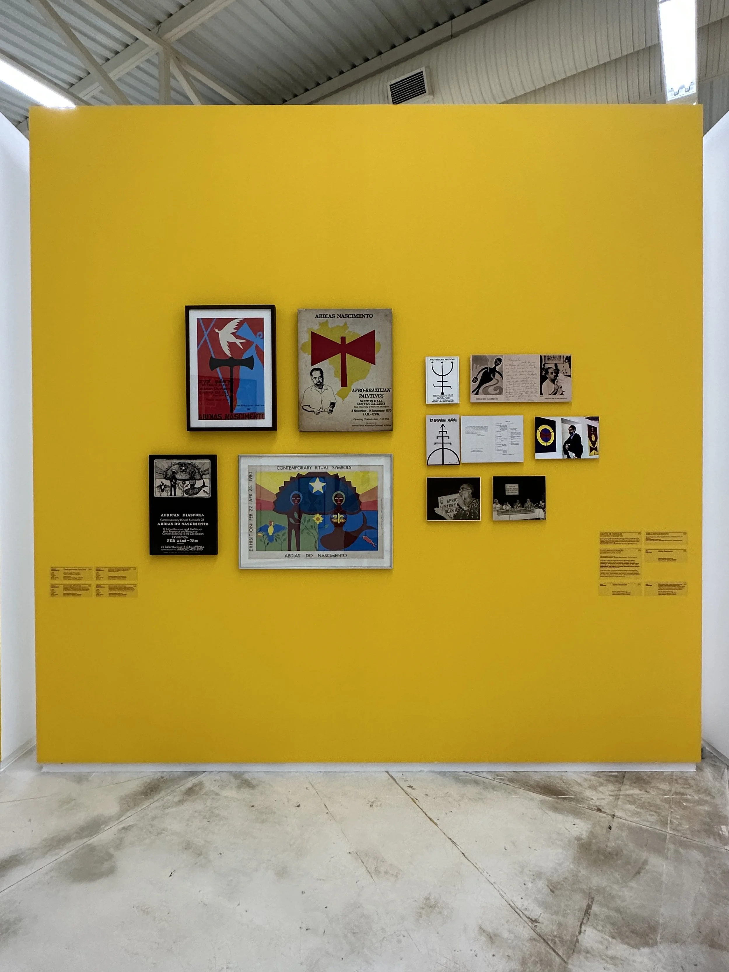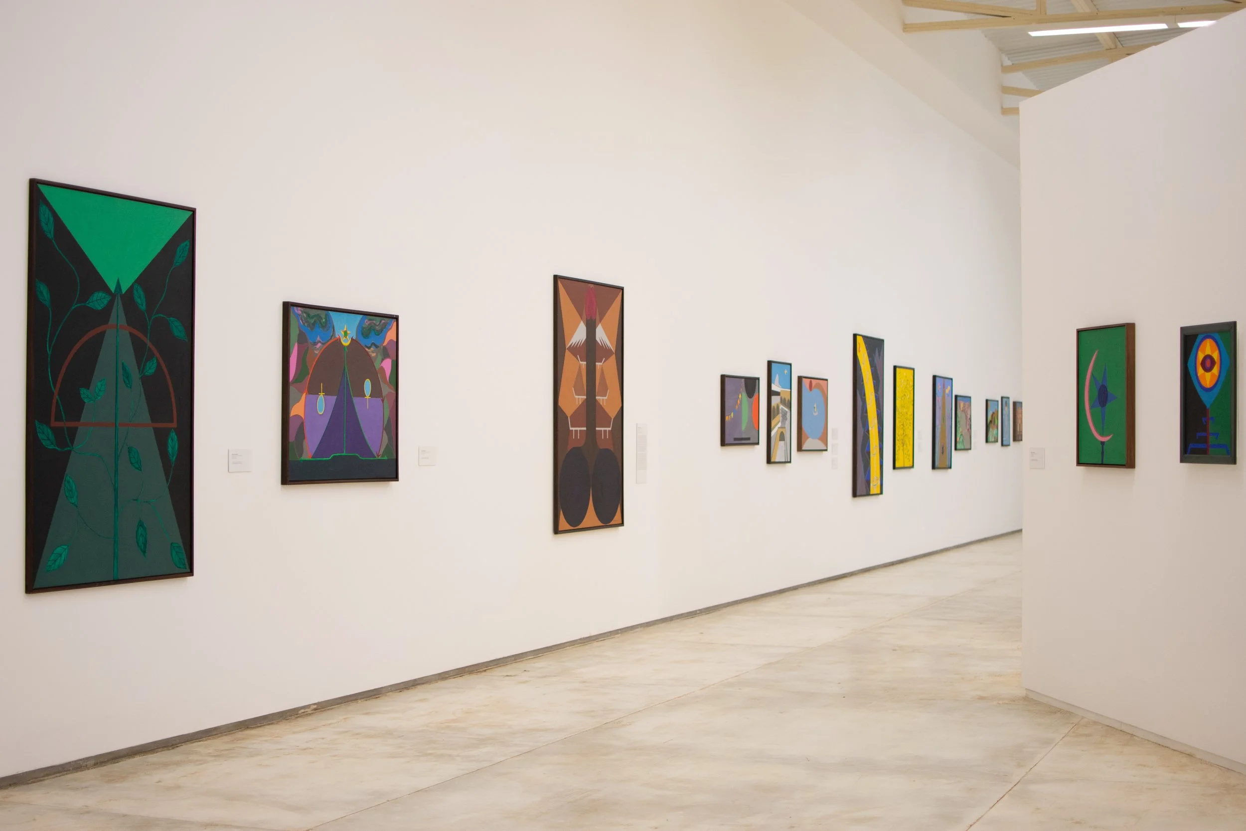 The exhibition design adopted as a principle the centrality of the Orishas in Nascimento’s work. Modular panels were designed and rearticulated for each act, inspired by sacred symbols: pontos riscados and the colors associated with the Orisha that governed the approach taken in each exhibit. Galeria Mata, which previously had been partitioned into rooms, was converted into a large hangar whose space was reconfigured for each exhibition.