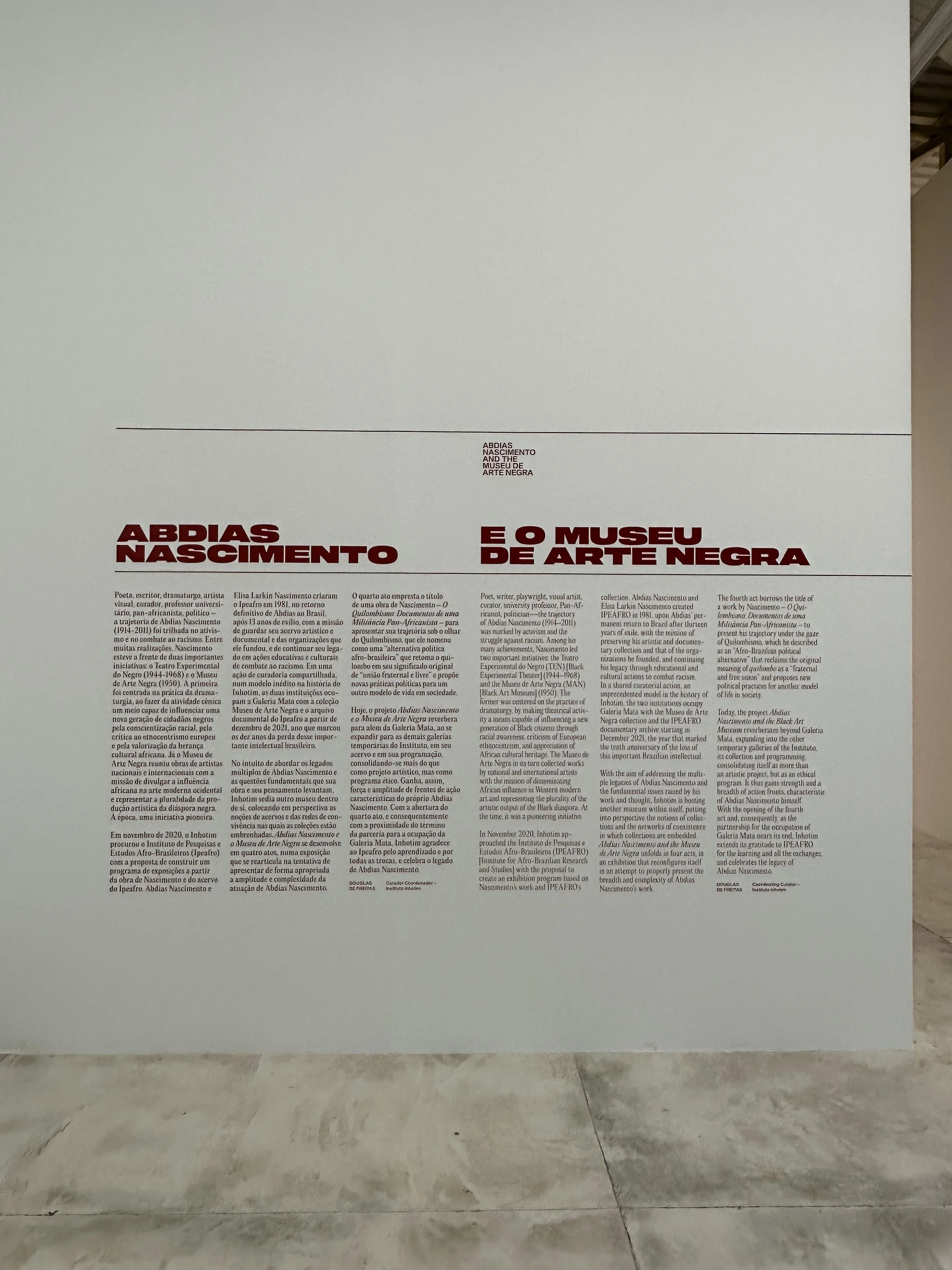 Em novembro de 2020, o Inhotim procurou o Instituto de Pesquisas e Estudos Afro-Brasileiros (Ipeafro) com a proposta de construir um programa de exposições a partir da obra de Abdias Nascimento e do acervo do Ipeafro. Em uma curadoria compartilhada, as duas instituições ocuparam a Galeria Mata de dezembro de 2021 - ano que marcou os dez anos da morte desse importante intelectual brasileiro - até abril de 2024, em quatro exposições temporárias que se sucederam ininterruptamente.